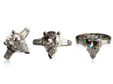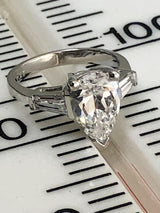 3 Carat Pear shaped AAA highest quality, IGI certified cubic zirconia ring, is also known as tear drop shape. The 3 carat pear measures 12 mm in length and 8 mm in width The center cz pear is set in V prong setting, the pointy part of the pear shape is protected by the V prong. The sides of the ring have long tapered cz baguettes in channel setting. This style is an all time classic.Heavy solid shank.