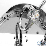 A stylish engagement ring with a high polished solid shank, a high quality cubic zirconia center stone with tapered baguette cubic zirconias in channel settings.