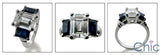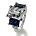An interesting three-stone ring with high polished solid shank, and AAA high quality emerald cut cubic zirconia center stone, with emerald cut sapphire cubic zirconia on each side.