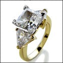 A stunning three-stone ring with solid high polished shank, with princess cut AAA quality cubic zirconia center stone set in 4 prong setting, and with diamond color trillion cut cubic zirconias set in prong setting on the sides.