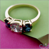 Classy tree stone ring with AAA high quality round stone in prong setting accompanied by sapphire color cubic zirconia on the sides