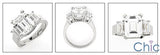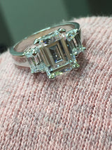 An outstanding ring with emerald cut center cubic zirconia in a prong setting with emerald cubic zirconias in prong settings on the side.