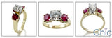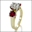 An alluring three-stone ring with high polished solid shank, AAA high quality round cubic zirconia center, with two round ruby color cubic zirconias on each side
