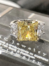 This breathtaking 3 stone ring is showcasing a 6 carat Canary Princess cut AAA highest quality, IGI certified cubic zirconia with cz trapezoids on the sides. The 6 carat princess cut has 10.5 by 10.5 mm dimensions. All 3 stones are set in prong style setting. The basket for the main stone is made in yellow gold.