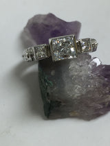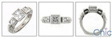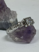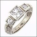 A gorgeous engraved ring with a princess cut high quality cubic zirconia center and side stones in bezel setting.
