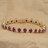 Elegant tennis bracelet set with AAA high quality IGI certified 0.50 each each Oval Rubies and Diamond round cz stones in 4 prong solid 14K gold setting. 23 Ruby color oval cubic zirconias are alternating with diamond color small round stones.The bracelet has a double secure lock.Shape: Oval/RoundCarat Weight: TCW 13.85Ct .