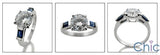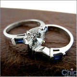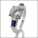A striking engagement ring with high polished solid shank, with AAA high quality round cut cubic zirconia center stone and sapphire color cubic zirconias tapered baguettes in channel setting on each side.