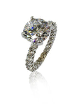 This Exquisite engagement ring displays a 5 carat AAA high quality IGI certified Round Cubic Zirconia. The center stone is placed in a unique Tulip Based prongs. The shank of the engagement ring has U shaped design and is set with round cz stones in eternity style.