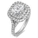 Absolutely gorgeous rounded cushion cut cubic zirconia engagement ring. Just like Tyffany's Soleste this classy cz engagement ring is showcasing a 2 carat AAA high quality, IGI certified Cushion cut center stone setted in prongs. The rounded cushion center stone cubic zirconia is set in a double halo encircled setting. The halos are jeweled with small round cz stones in pave setting. The split shank has pave set stones as well. The cz engagement ring is made in 14k solid white gold. "14K" stamp is inscribed. The 14k white gold has a Rhodium coating as well.