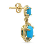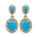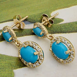 Elegant drop style earrings with Turquoise stones and high Quality round cubic zirconia halo with pave setting.The length of the earrings are almost an inch drop.The top drop is 0.25 oval Turquoise, the bottom drop is 1.5 carat oval stone. The tiny pave set stones add an exquisite detail to this pair of earrings..Solid 14K Yellow Gold.The earrings have bush back style secure backings.