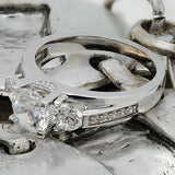 This Engagement ring is showcasing a 1.25 High Quality Cubic Zirconia, IGI Certified center stone.It is set in 4 prong setting. The sides have 0.40 carat each immediate side stones, the shank is jeweled with pave set small round stones as well.