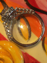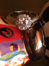 1.25 Carat Round Cubic Zirconia AAA High quality, IGI certified center stone is set in a breathtakingly beautiful halo style engagement ring setting. The center stone's halo is set with small round cz stones. The sides of the shank are jeweled with round stones in shared prong style setting. Underneath the beautiful halo is a bezel set round stone with filigree detail. The cz engagement ring is made in 14k solid white gold. "14K" stamp is inscribed. The 14k white gold has a Rhodium coating as well.
