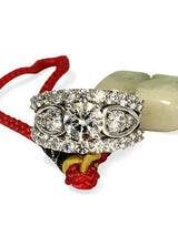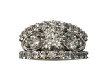 This beautiful ring gives an illusion of an engagement ring and 2 matched bands, but in fact this is a 1 piece ring. The overall profile of this engagement ring is considered a low set profile. The main stone is a AAA highest quality, IGI certified cubic zirconia in 4 prong setting.The sides stones are set in a pear shaped contour with round stones. The ring measures at 12.5 mm at the widest point. This is a very heavy and solid piece. This style can be used as an anniversary ring as well.