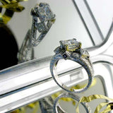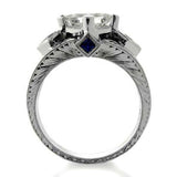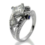 This fascinating engagement ring has AAA high quality, IGI certified princess cut cubic zirconia 1.5 carat center stone and around half carat total bezel set side stones. The front and back view is showcasing .10 carat sapphire princess cubic zirconias. The split sides of the shank as well as the whole ring is covered by hand engraving, which makes this ring a piece of art. No two rings are alike.