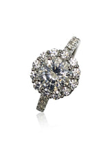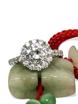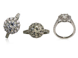 Elegant engagement ring set with AAA highest quality, IGI certified round cubic zirconia in 4 prong setting. The halo around the main stone is set with U pave set style round small stones. The shank is set with U pave style small cz stones as well. The band is 2.3 mm wide.
