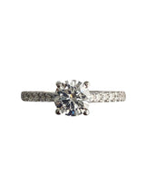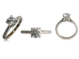 Elegant 1 carat AAA Highest Quality, IGI certified round center stone engagement ring. The center cz is 6.5 MM in diameter. It is set in 4 prong stetting. The sides of the shank are set with small pave set stones. The width of the shank is 2 MM in width.