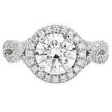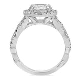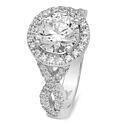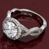 14k White Gold Bridal Ring is featuring an AAA High quality, IGI certified Round Center stone cubic zirconia. The cz is set in 4 prong setting. It is also surrounded by a beautiful halo. Halo is hand set with pave style small round stones.. The shank of the ring has eternity symbol that's also jeweled with pave set round stones.