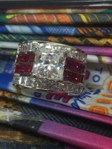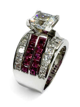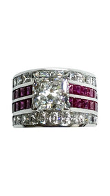 WOW! A True show stopper! This engagement ring is set with AAA high quality, IGI certified Princess cut center stone in 4 prong Tiffany setting,elevated sides are set with 2 rows of channel set Ruby color Cubic Zirconia princess cuts in addition to two more lower rows set with clear diamond color CZ princess cuts as well. Heavy, solid shank 15mm wide. Seems as if it is a combination of 1 engagement ring and 2 wedding bands.