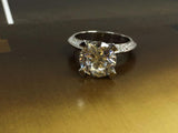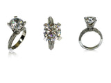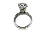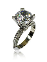 This 3 Carat Round AAA High Quality IGI certified Cubic Zirconia Engagement Ring is for people that love tall/high profile settings. The height of the ring is 12 mm. The 3 carat CZ is set in 4 prongs setting. The prongs are jeweled with micro pave small round stones. The knife shank is 3.25 mm wide and has stones in 4 rows total. The engagement rings sides stones go half way down the shank. This engagement ring has more than 130 stones.