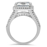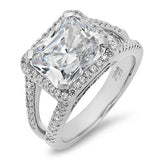 4.5 Carat AAA High Quality IGI certified radiant cut cubic zirconia set in horizontal position. The center stone is surrounded by pave set halo. The sides of the shank display a split style that is jeweled by small round pave set stones. The cubic zirconia engagement ring is made in 14k solid white gold. "14K" stamp is inscribed. The 14k white gold has a Rhodium coating as well.