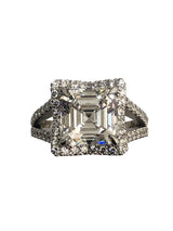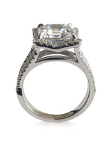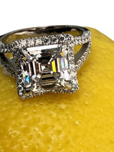 AAA Highest Quality Asscher Cut Cubic Zirconia , IGI certified Center Stone Ring. This engagement ring's center stone is set in claw prong setting, with elongated prongs at the edges, the 5 carat asscher cut is 10 mm by 10 mm in dimensions. It is surrounded by a square halo, that's set with small pave set stones. The Split shank is jeweled with small paves as well.