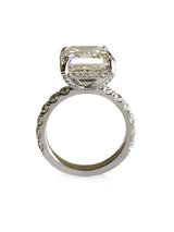 This breathtaking engagement ring is showcasing AAA highest quality, IGI certified 5 Carat Emerald cut cubic zirconia. The center stone is set in 4 prong setting. The prongs are set with micro pave small cz stones, what adds to this elegant piece is a pave set hidden halo. The shank is 2.5 mm in width. It is set with French style pave, that extends halfway down the band..The palm side of the ring and band is made in solid metal, no stones. Great for resizing or comfort.