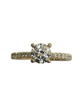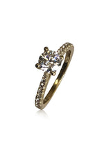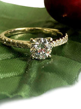 Elegant engagement ring set with AAA highest quality, IGI certified round center in 4 prongs style setting. The shank is 2.0 mm wide and is set with small pave set round cz stones halfway down the shank.