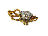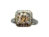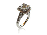 Vintage style engagement ring with AAA high quality, IGi certified 2.5 carat rounded brilliant cushion cut center stone set in double wire prong setting. The center stone is surrounded by pave set small round stones in a halo. Shank is set with pave set stones on all the sides- top, front and back views of the ring.