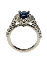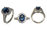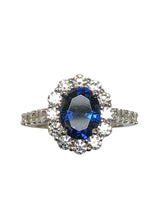 This royal style engagement ring is inspired by Princess Diana's own engagement ring. The ring is showcasing sapphire blue oval 2.5 carat highest quality cubic zirconia,IGI certified center stone in prong setting, surrounded by halo that has clear AAA highest quality small round stones. Elegant detail of a bezel set cz stone underneath the main stone adds a unique touch to this piece.