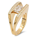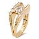 This CHIC 1.5 carat Emerald cut cz Engagement ring is showcasing AAA high Quality IGI certified center stone. The emerlad cut center stone is set in horizontal position that is set in suspended style channel setting. The split style shank is accented with small pave set stones. The overall squarish style is called European.The cubic zirconia engagement ring is made in solid 14K yellow gold. "14K" stamp is inscribed. Heavy solid shank.