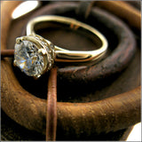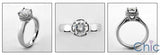 An extraordinary yet simple engagement ring with high polished solid shank, a high quality round cubic zirconia center stone with round cubic zirconias in pave setting around the sides of the center stone.