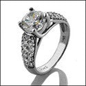 A stunning engagement ring with a 1.25 carat round high quality cubic zirconia center stone set in four prong, and round stones set in pave on the sides.