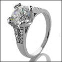 A dazzling engagement ring with high polished solid split shank, with round cut AAA quality cubic zirconia center stone set in pring setting, and with round cut diamond color high quality cubic zirconia stones set in pave on the split shank.