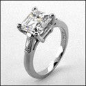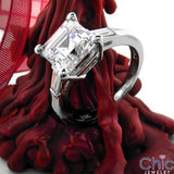A striking engagement ring with high polished solid shank, a high quality asscher cubic zirconia center stone in a prong setting with two baguette cubic zirconias embedded on the sides in channel settings.