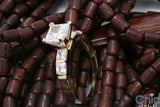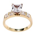 A beautiful engagement ring with high polished shank and AAA high quality princess cut diamond cubic zirconia in prong setting with princess cut diamond cubic zirconias in channel setting on the sides.