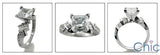 A lovely engagement ring with high polished solid shank, AAA quality princess cut center cubic zirconia, with round cubic zirconia stones set in channel and baguettes on the sides