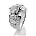 1.5 round diamond quality cubic zirconia stone set in 6 round, heavy wide shank, sides have baguettes and princess cut stones set in channel.