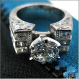 Eye catching engagement ring set with 1.5 carat AAA quality round stone in 6 prong setting & round cut CZ's set in channel on the sides. Hand made exquisite engraving all through out the ring