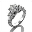 An antique looking ring with a AAA quality round center stone set in six prong tiffany style setting. The side stones are set with round shapes in prong setting and baguettes in channel. Delicate heart shape designs inside of the contours. Engraved shank.