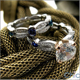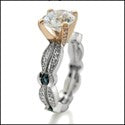 Fancy engagement ring in two tone metal. Rose gold prongs are set with AAA high quality round center stone prongs are jeweled by micro pave round stones. Sides are set in with sapphire and clear color round stones in half bezels and paves all the way around the band in eternity format.