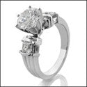 This stunning ring features a 1.5 carat round diamond quality AAA cubic zirconia stone set in 6 prong, heavy shank with lines, 2 princess cut stone in channel setting on the sides.