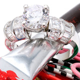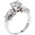 Classy cubic zirconia engagement ring in combination of AAA high quality, IGI certified round cubic zirconia center stone in prong setting. The round cz center stone is 1.75 carats. The cz engagement ring has AAA high quality princess cut stones and baquettes in channel setting on the sides of the dome shank.The ring is made in solid 14k white gold setting. It has a stamp of "14k" as a proof for gold's karat used in making this beautiful ring.