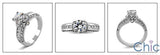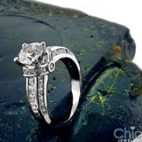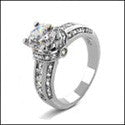 A eye catching engagement ring with high polished solid shank, with high quality round cubic zirconia center stone set in prong, with high quality round cut cubic zirconia set in channel setting on the sides, and also with high quality round cut cubic zirconias set in pave and burnished.