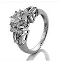 An outstanding engagement ring with a high polished solid shank, with a round high quality cubic zirconia center stone in six prong, and a combination of rounds and baguettes on the sides.
