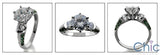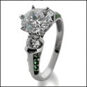A lovely engagement ring with a 1.5 carat round shape AAA high quality cubic zirconia center stone set in prong tiffany setting, two round stones in channel on the sides, as well as emerald color stones set in pave on the sides