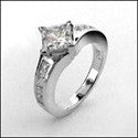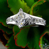 A striking engagement ring with a high polished solid shank and a high quality princess cut cubic zirconia in V prong setting, and princess cut cubic zirconias on the sides in chanel setting.
