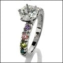Multi color engagement ring, center is set with AAA quality 1Ct . round stone in tiffany setting & sides have colorful round stones in prong setting