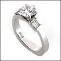 An engagement ring that is simply elegant with a round high quality cubic zirconia center stone in a six prong Tiffany style setting and long baguette shape cubic zirconias on the sides in channel setting.