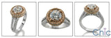 Classy engagement ring with antique style in two tone metal, topped with AAA high quality round center stone in prong setting in ROSE gold, covered with tiny round stones in pave setting. Split shank is set with micro paved round stones.