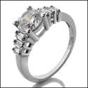 A appealing gorgeous engagement ring with high polished solid shank, with round cut AAA quality cubic zirconia center stone set in prong, and with diamond color cubic zirconias graduated straight baguettes in prong setting on the sides.